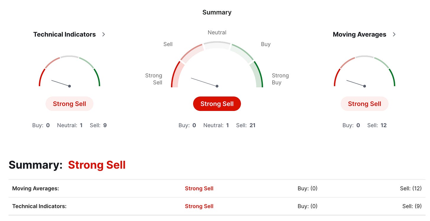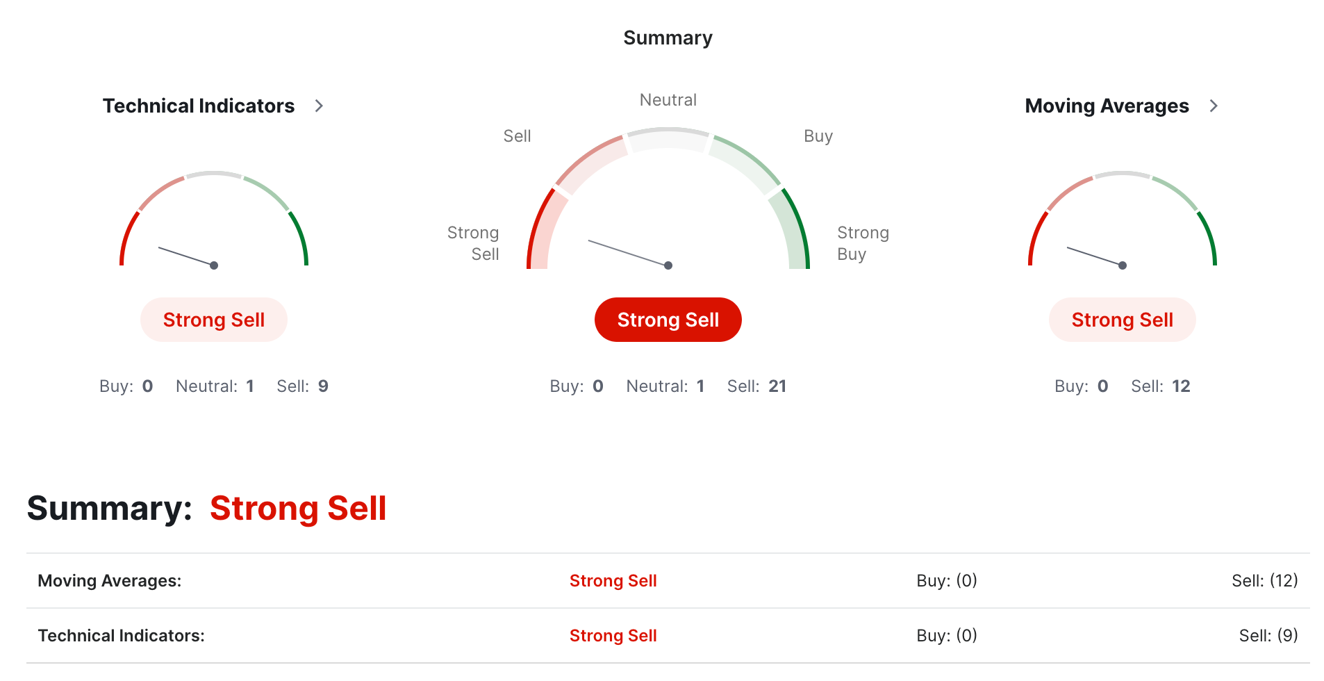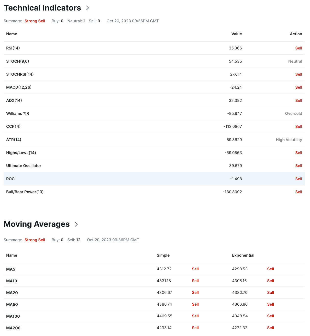 From the 1D technical indicators above, there are a total of 0 (Buy), 21 (Sell) and 1 (Neutral). Investing recommends the “STRONG SELL” recommendation based on the technical indicators above (1D chart for S&P500).