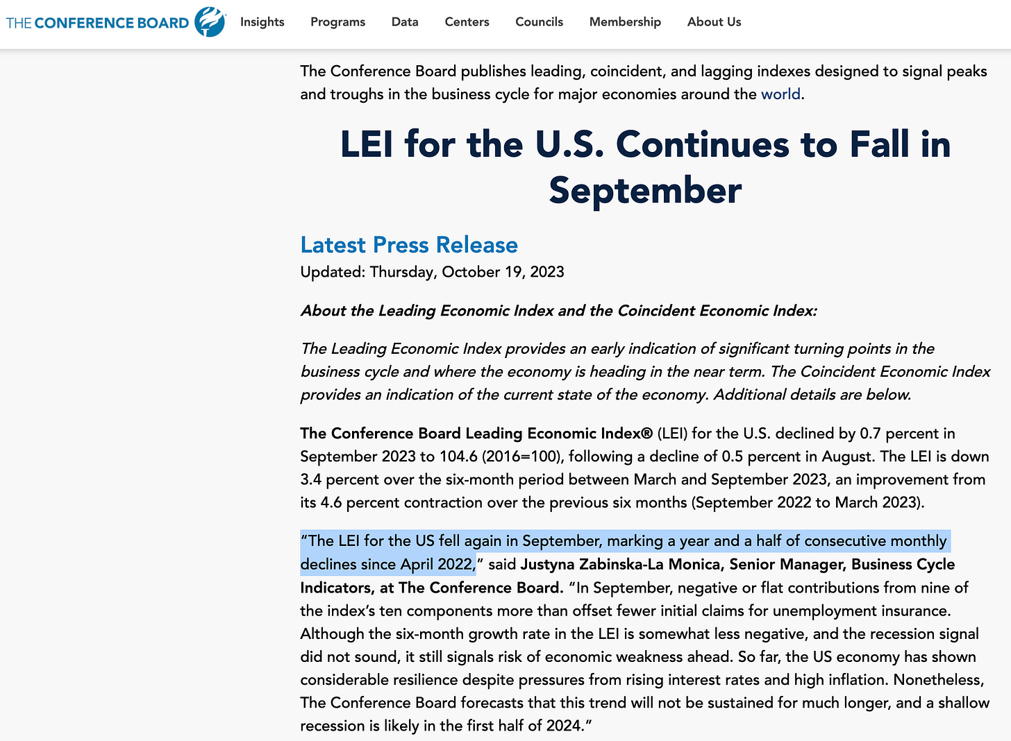 The leading economic index sank 0.7% in September and was negative for the 18th month in a row — but the U.S. is still on track to post a sizable increase in economic growth in the third quarter. The Conference Board reported that the leading economic indicators have fallen over 18 consecutive months since Apr 2022 as per the 20 Oct 2023 report.