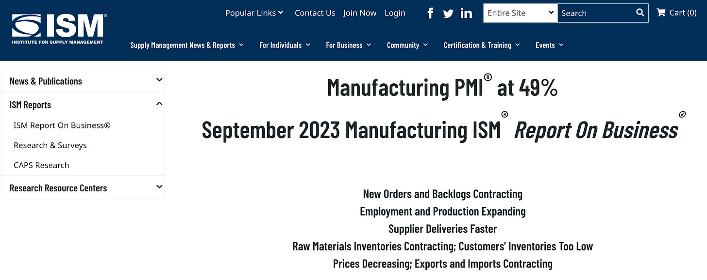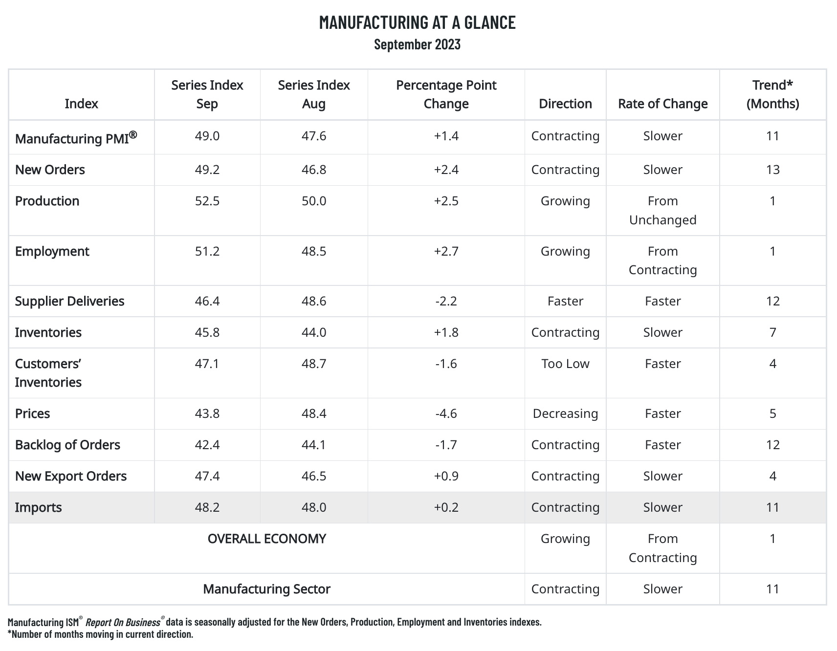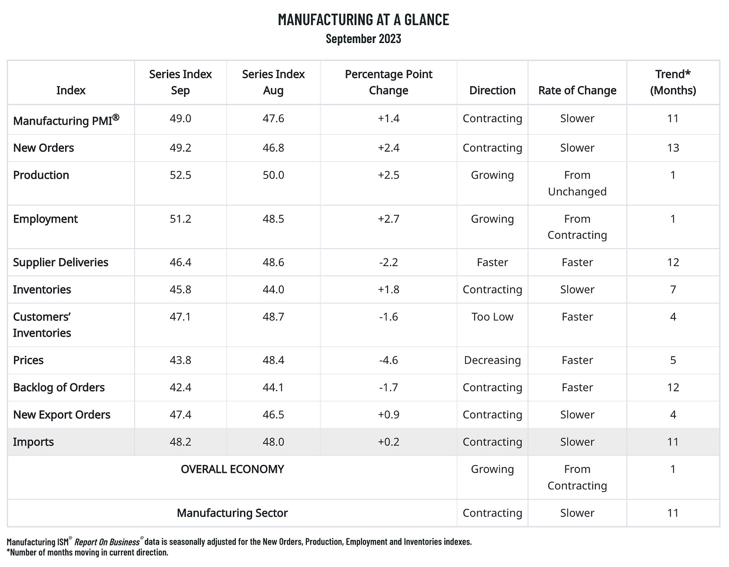 In conclusion, ISM concludes that Sep 2023 data implies a growing overall economy and a contracting manufacturing sector.