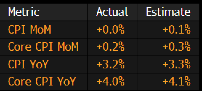 From the data, the CPI MoM has remained. The Core CPI MoM increased by 0.2% (compared to the estimate of 0.3%). Core CPI YoY is 4.0% compared to the estimate of 4.1%.