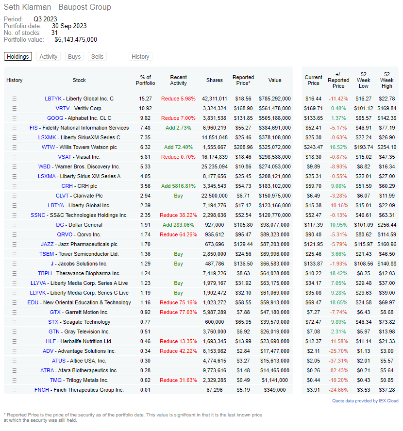 - Baupost has added new positions in Clarivate, Tower Semiconductor, Liberty Media Corps, and Jacobs Solutions. These companies are largely unheard of for me.