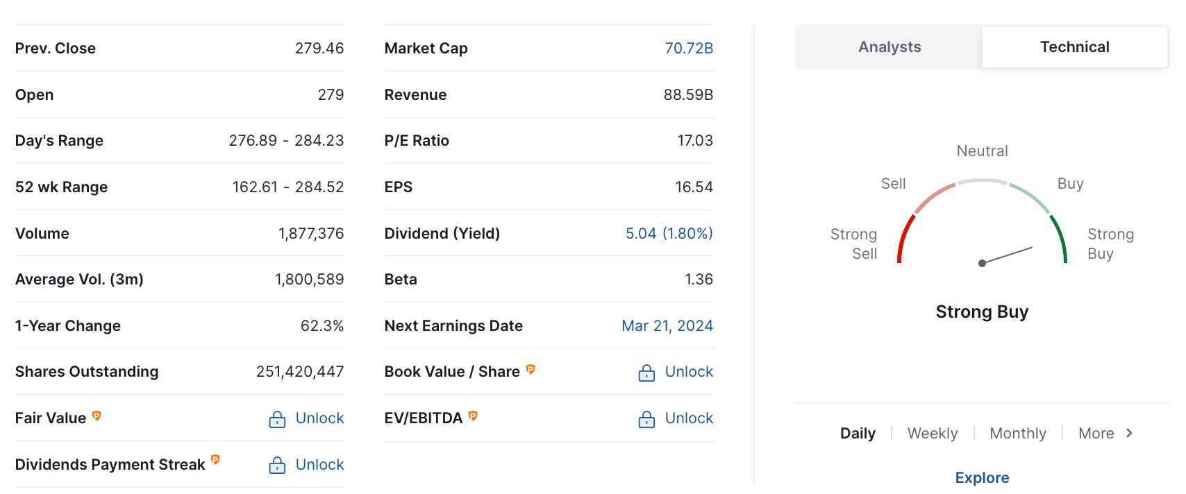 FedEx’s stock price has hit a record 52-week high recently and has grown 62.3% from a year ago. From Investing, it has a “Strong Buy” status.