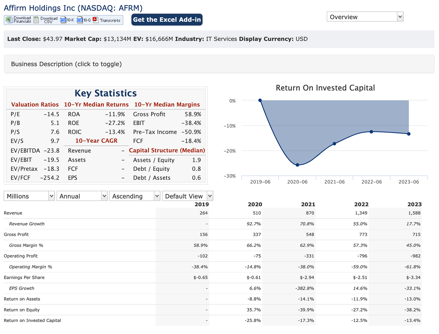 Affirm is one of the players in the BNPL space. While they have enjoyed strong revenue growth from $264M (2019) to $1,588M (2023). They have yet to break even and in fact, their losses have continued to grow from $102M (2019) to $982M (2023). Their operating losses are not trending in the right direction. We should monitor defaults and their expenses. These could be one of the sectors greatly affected during a downturn.