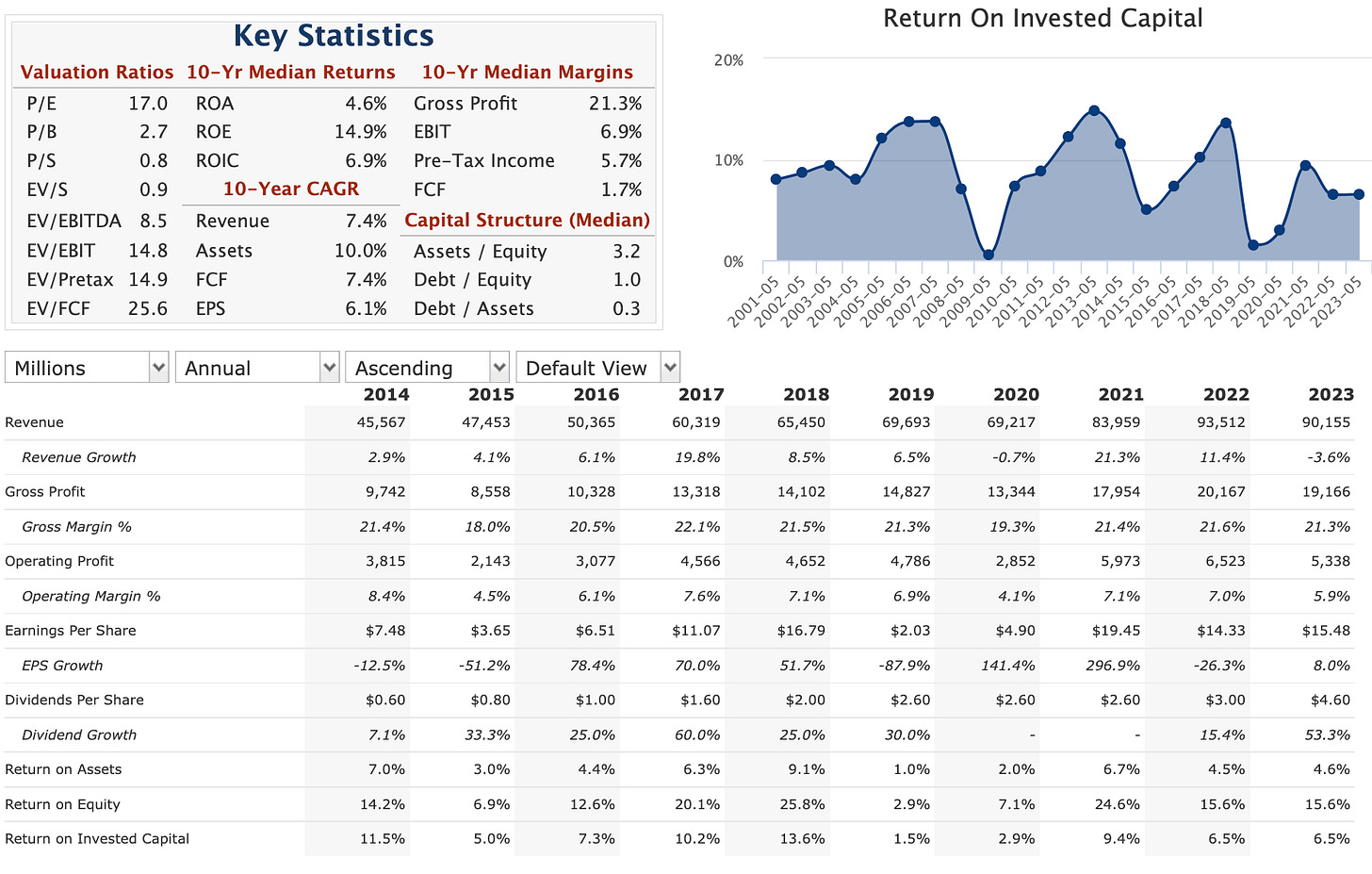 - Revenue has almost doubled in 10 years from $45B (2014) to $90B (2023)